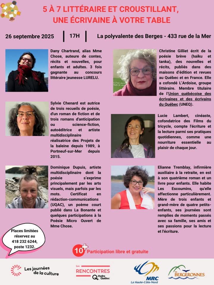 C'est avec grand plaisir que je participe au 5 à 7 littéraire organisé par Christine Gilliet à l'occasion des Journées de la culture 2025, avec la contribution des partenaires Les journées de la culture, Les Rencontres Hydro-Québec, MRC Haute-Côte-Nord et Municipalité des Bergeronnes. L'évènement a lieu à la polyvalente des Berges aux Bergeronnes à 17h vendredi 26 septembre 2025. Les écrivaines sont Dany Chartrand, Sylvie Chenard, Dominique Dupuis, Christine Gilliet, Lina Lambert et Elianne Tremblay.