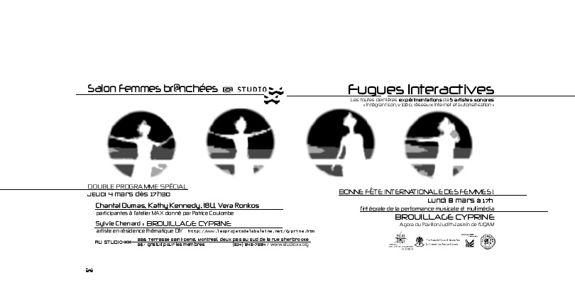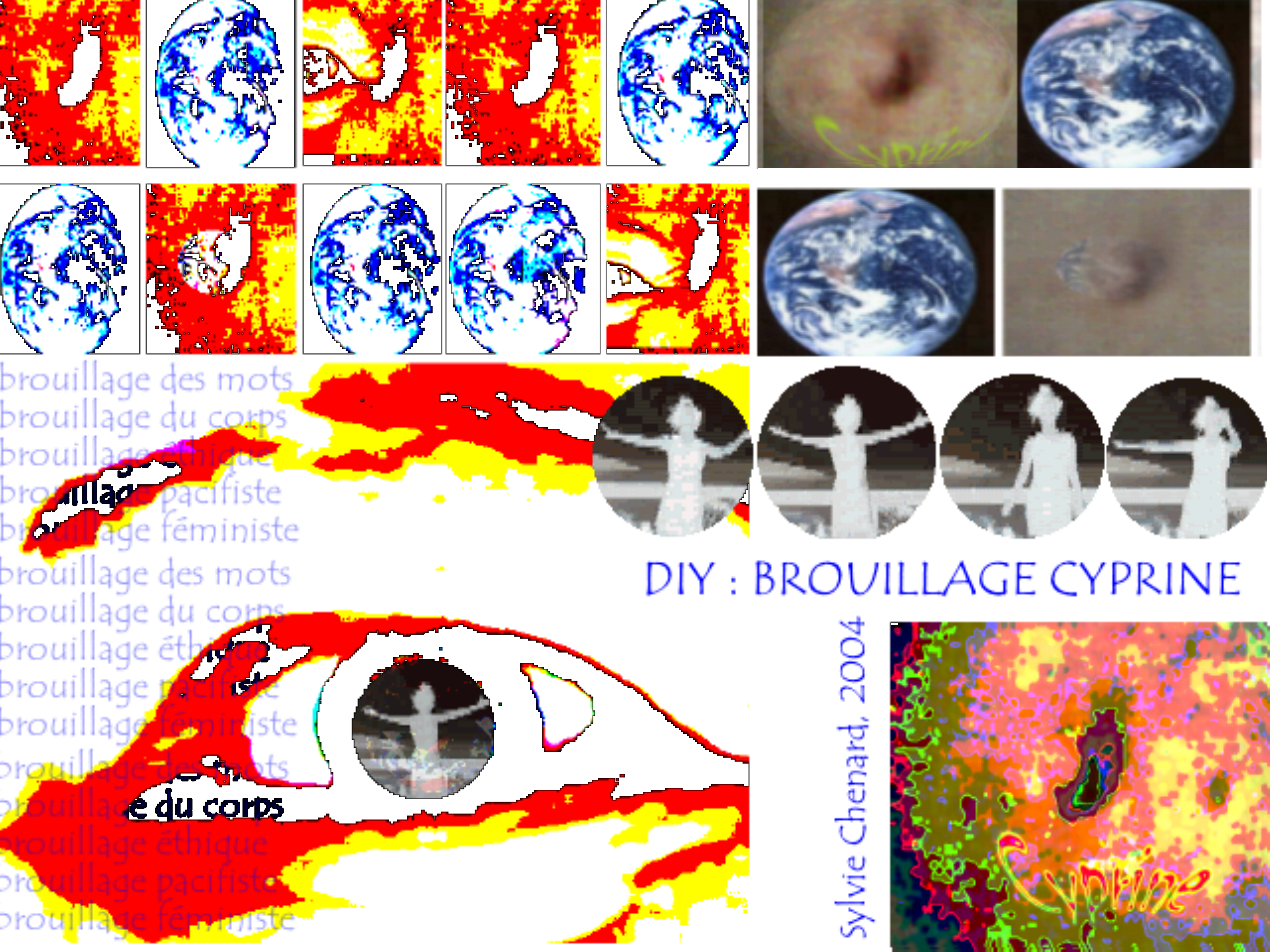 DIY (Do It Yourself) : BROUILLAGE CYPRINE ![]() Cliquez ici, pour regarder la vidéo et télécharger DIY : Brouillage Cyprine en format Director. DIY : BROUILLAGE CYPRINE RÉSIDENCE La création DIY : BROUILLAGE CYPRINE de Sylvie Chenard est une coproduction avec le StudioXX ![]() De janvier à mars 2004 le StudioXX accueille Sylvie Chenard à sa résidence d'artiste ayant pour thème Do it Yourself. Elle y élabore une étude sur le brouillage culturel, la libération du plaisir des femmes et un environnement social, culturel et naturel, virtuel, technologique respectueux des droits humains, les alternatives libres et non commerciales tels le logiciel libre, le code libre, la libération des droits d'auteur et les droits de l'auteure, de l'artiste et de la programmeure, les contrôles à distance pour la guitariste, un documentaire sur la méconnaissance du mot cyprine et les alternatives libres et non commerciales lors des menstruations, un questionnement sur les virages politiques, économiques et technologiques anti-démocratiques. Ces études et réflexions mènent à la réalisation du projet solo DIY : Brouillage cyprine, une performance d'improvisation multimédia interactif et une création web. LE PROJET DE DÉPART Do it yourself / Fais ça toi-même! est un projet d'exploration pour une improvisation multimédia interactif féministe, qui questionne différents aspects du brouillage culturel, social, politique auxquels nous sommes confrontées constamment avec l'envahissement des technologies, particulièrement de communication, et les développements mondiaux anti-démocratiques et anti-écologiques qui se renforcent. C'est par l'entremise du jeu, de l'expérimentation, de la réflexion que s'offre une trajectoire critique et auto-critique de ces puissantes machines qui nous conditionnent, nous polluent, en puisant dans les énergies solidaires, amoureuses et festives du présent, que Do it yourself / Fais ça toi-même! met en scène ou favorise. Brouillage des mots, brouillage éthique, brouillage du corps, brouillage politique, brouillage féministe, brouillage écologiste! Do it yourself / Fais ça toi-même! Faire ça soi-même! Faire ça pour soi-même! Faire ça pour le monde! DIY : BROUILLAGE CYPRINE, PERFORMANCE ET CRÉATION WEB ![]() Pour une version de l'image de qualité cliquez Les brouillages de la mondialisation, du e-capitalisme, de la publicité et de la pornographie, du cyberespace territorialise le corps, le statut économique (pauvreté extrême) et le rôle des femmes dans une dépendance, un assujettissement des femmes et de la représentation des femmes à la production, la reproduction, la compétition et la surconsommation. Ceci s'inscrit toujours dans un système, une structure, une machine sociale discriminatoire et profitable seulement à une minorité, où nombreuses femmes vivent une extrême pauvreté et dont les droits humains sont loin d'être respectés. Les jouissances et réjouissances des femmes sont encore tabous à ce point qu'un mot comme cyprine, est encore méconnu du grand public. Ce mot magnifique qui concerne la moitié de la planète a été effacé des dictionnaires et est réapparu dans les années 80 à l'Office de la langue française, publié dans le Grand dictionnaire des terminologies sur Internet http://w3.granddictionnaire.com. Chaque femme qui connaît ce mot a sa petite histoire à nous raconter. Moi c'est en lisant l'essai de Denise Boucher intitulé "Cyprine" fin des années 70. Selon le dictionnaire, les origines du mot cyprine sont du latin "Cypris", du grec "Kuprir", surnom d'Aphrodite, et " -ine ". Il s'agit d'un nom féminin dont la définition du domaine médical est sécrétion vaginale et la définition du domaine général est sexe de la femme. Il y a toutes sortes d'expressions populaires pour nommer la réalité de la cyprine. On l'appelle communément le jus des femmes quand elles ont du plaisir, plaisir polymorphe non limité au sexe. On la nomme communément la mouille, pussy juices, muzga. Cela coule de sources sûres quand on mange du chocolat, qu'on écoute de la musique, qu'on partage un moment convivial entre amis. On la nomme communément en dehors des mots discriminés, des prisons culturelles. Connaissez-vous le mot cyprine? Do you know the word cyprine? Y a-t-il un mot pour ça dans votre culture? Nommer la réalité des femmes échappée des tabous et de l'aliénation de leur jouissance. DIY : Brouillage cyprine propose de déterritorialiser la sexualité et le corps des femmes, la culture, l'identité, le langage, les mots, le plaisir, l'éthique, les technologies de communication dans une perspective de libération, d'équité et de paix dans le monde. Brouiller soi-même les brouillages qui nous embrouillent, de créer des solidarités qui nous permettent d'atteindre dignité, le développement humain et le respect des droits fondamentaux pour toutes et tous. L'approche est documentaire et poétique et témoigne de la méconnaissance issue des réalités cachées, situation que le féminisme des années 2000 entend critiquer, resituer, rendre visible et partager dans ses réseaux solidaires mondiaux. DIY : Brouillage cyprine est une contribution pour l'exercice de la citoyenneté des femmes et l'amélioration de l'existence et de l'expérience des femmes dans les sociétés. Tout le plaisir est pour moi, et pour vous j'espère. Remerciements à l'équipe du StudioXX, à Jon Asencio et à toutes les personnes qui ont contribué au développement d'un tel projet. Sylvie Chenard, 2004 DIFFUSION DE LA PERFORMANCE DIY : Brouillage cyprine est une performance multimédia improvisée où l'interactrice orchestre au présent sa poésie sonore et visuelle, sa voix, sa guitare électrique, ses électroniques, son électroacoustique, ses illustrations, sa vidéo et son interaction numérique. Ce brouillage philosophe et imaginaire contribue à rendre public ce merveilleux mot qu'est cyprine et nous pa