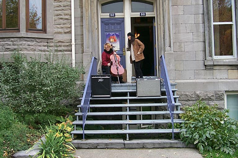 Reportage photos de Denis Noël de la performance de Sylvie Chenard et Hélène Boissinot qui jouaient le thème "Du pain et des Roses" revisité, balcon rue Cherrier, lors du Rassemblement québécois à Montréal, le 14 octobre 2000, où environ 30,000 personnes ont marché. Activité québécoise de la Marche mondiale des femmes contre la pauvreté et contre la violence faite aux femmes Merci au Centre de documentation sur l'éducation des adultes et la condition féminine pour son appui. © photo, Denis Noël, 2000 Reportage photo de Denis Noël * l'animation de deux ateliers de création et de prise de parole "Manifestive, Atelier, par Sylvie Chenard avec la collaboration d'Hélène Boissinot, pour réaliser un manifeste collectif sur place, concernant les thèmes de la Marche,Mercredi le 11 octobre à la Place Émilie Gamelin à 13h30 (premier atelier) et à 19h30 (deuxième atelier); Projet de la baleine à venir "Manifestive, atelier pendant la Marche mondiale des femmes contre la pauvreté et la violence faite aux femmes. * la participation de Sylvie Chenard au comité musique et à l'organisation d'un spectacle multiethnique "Solidaires avec les femmes du monde" au Parc Lafontaine le 14 octobre 2000 de 10h00 à 12h00 sur la scène couverte, et en tant que musicienne, à 10h00, une performance inspirée de la pièce "La violence faite aux femmes est inacceptable" (dite par des femmes d'origines ethniques diverses dans plusieurs langues) interprétée, improvisée par Sylvie Chenard avec Hélène Boissinot, les femmes du Collectif des femmes immigrantes, de l'Association des femmes autochtones entre autres, * le spectacle balcon "Du pain et des roses" revisité : Entre 12h45 et 13h45, le 14 octobre, s'est tenu un spectacle balcon rue Cherrier, de Sylvie Chenard et Hélène Boissinot, sur le trajet de la marche du rassemblement national à montréal, de la Marche Mondiale des femmes. Elles ont improvisé à partir de la chanson thème Du Pain et des Roses, de la marche québécoise contre la pauvreté de 1995. Sylvie Chenard à la guitare électrique, électroniques, citations et Hélène Boissinot au violoncelle, électroniques. Manifeste, CD 2000 et photos expérimentales de Sylvie Chenard de la Marche des femmes contre la pauvreté 1995 Cliquez sur les images © Sylvie Chenard, Les projets de la baleine 2000